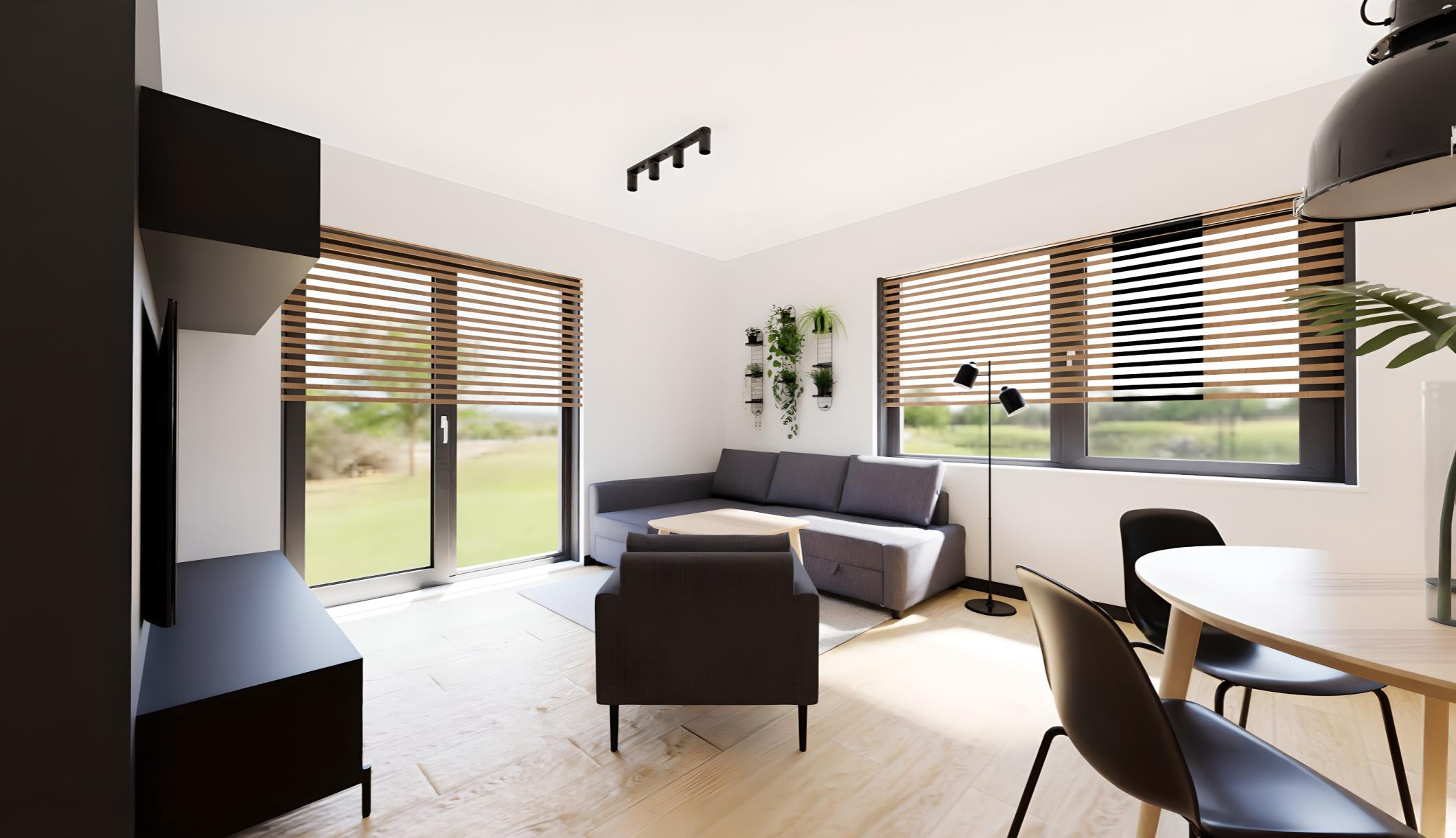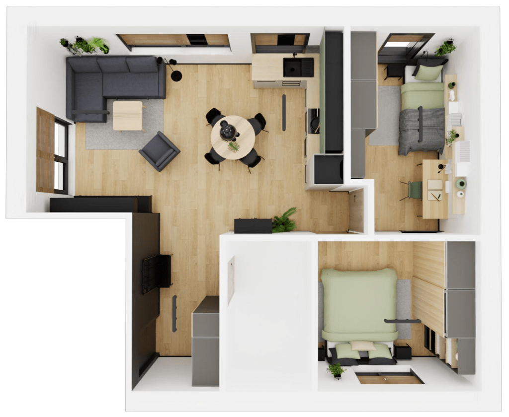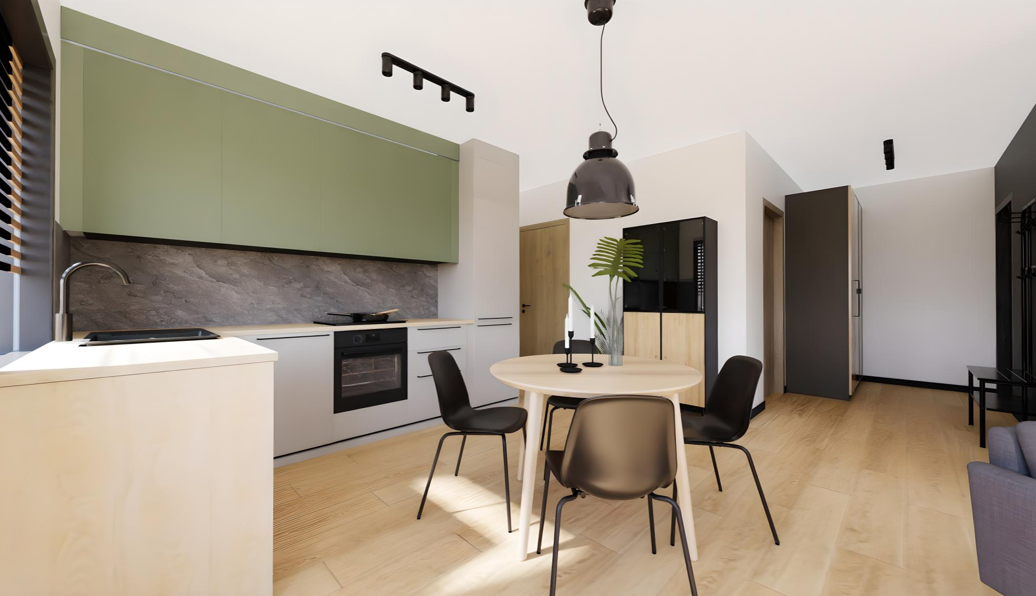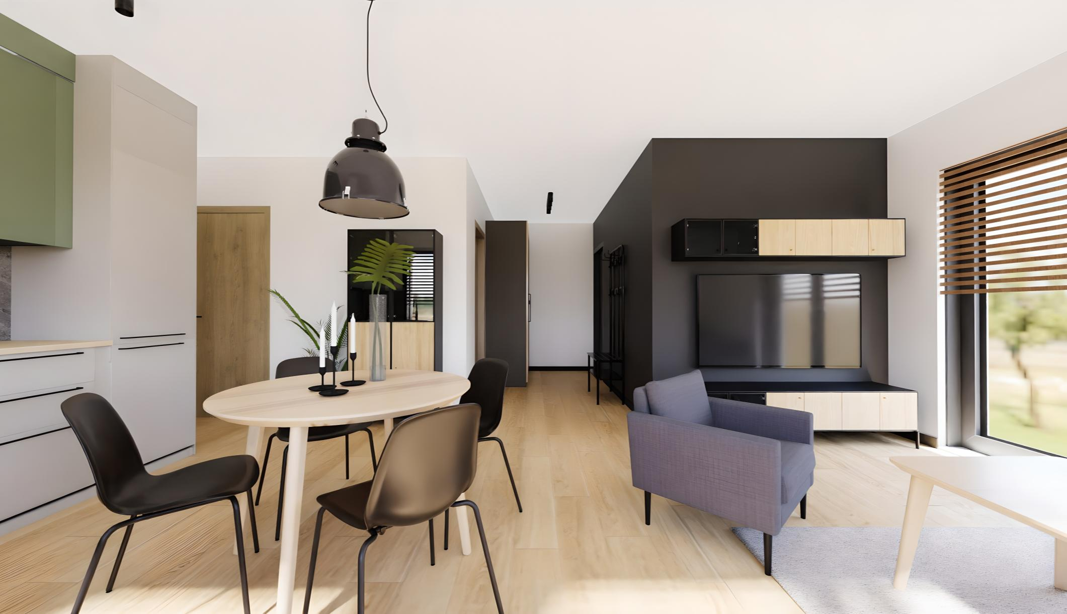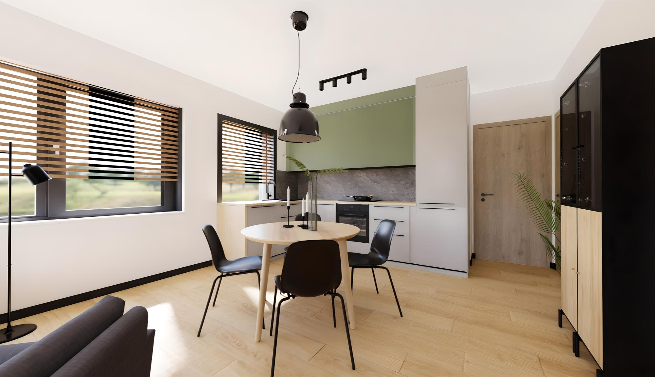 Przemyślany projekt (2 sypialnie + łazienka + salon z kuchnią) sprzyja integracji. Otwarta strefa dzienna pozwala cieszyć się kontaktem z rodziną i gośćmi nawet podczas przygotowywania posiłków.