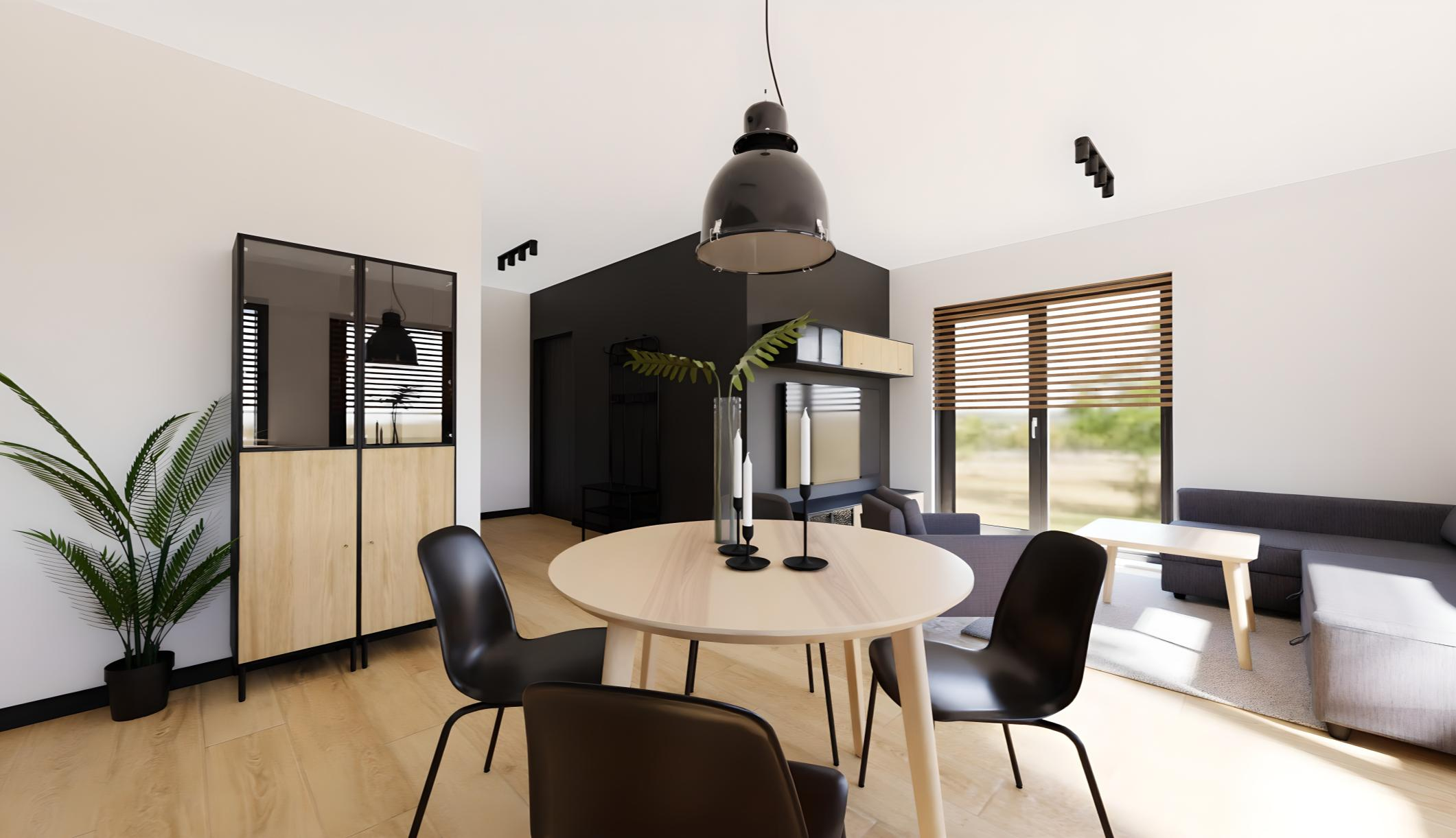 Duże przeszklenia w salonie i jadalni gwarantują mnóstwo naturalnego światła, a wyjątkowa ustawność pomieszczeń daje nieograniczone możliwości aranżacyjne.