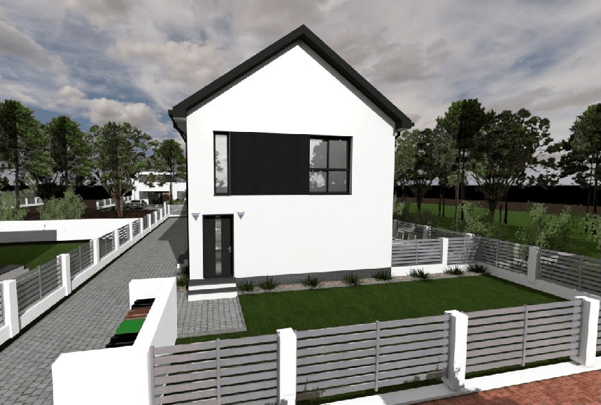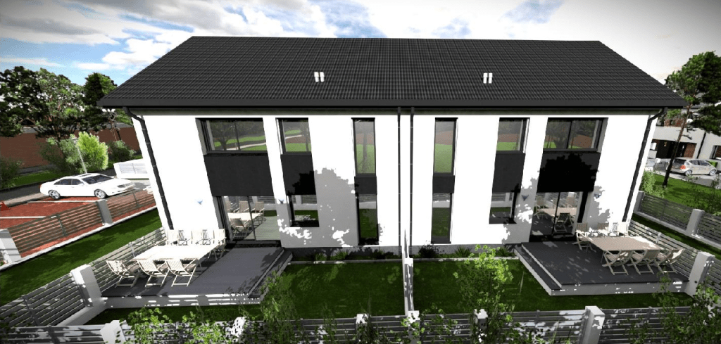Budynek to nowoczesny bliźniak dwulokalowy, oferujący łącznie cztery przestronne mieszkania (dwa na parterze oraz dwa na piętrze), z których każde posiada własny ogródek o powierzchni ok. 50 m².